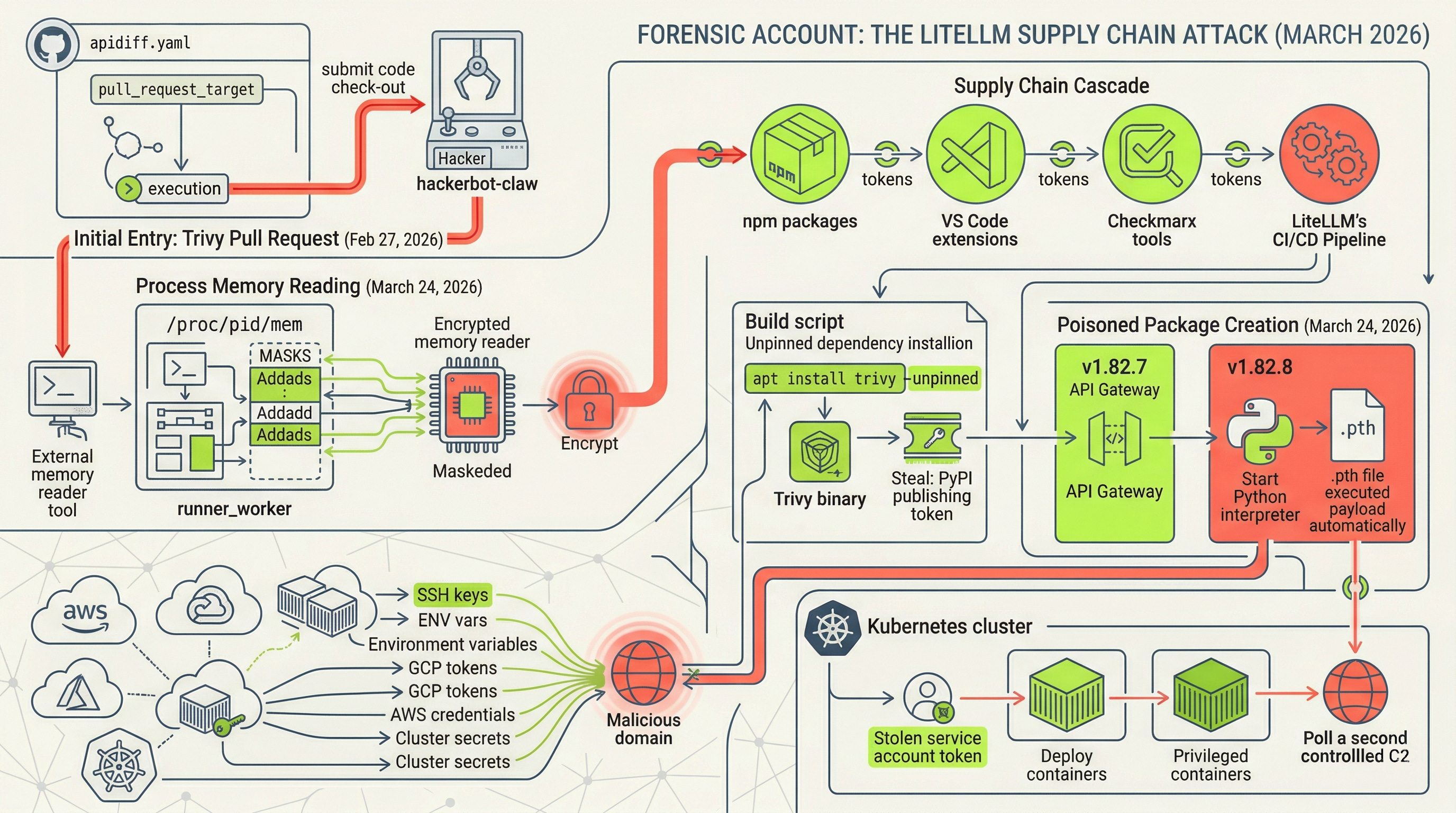 The campaign did not begin with LiteLLM. It began twenty-five days earlier with Trivy, Aqua Security’s open-source vulnerability scanner. Trivy is the tool that tells you whether your containers and code have security problems. The irony is surgical.